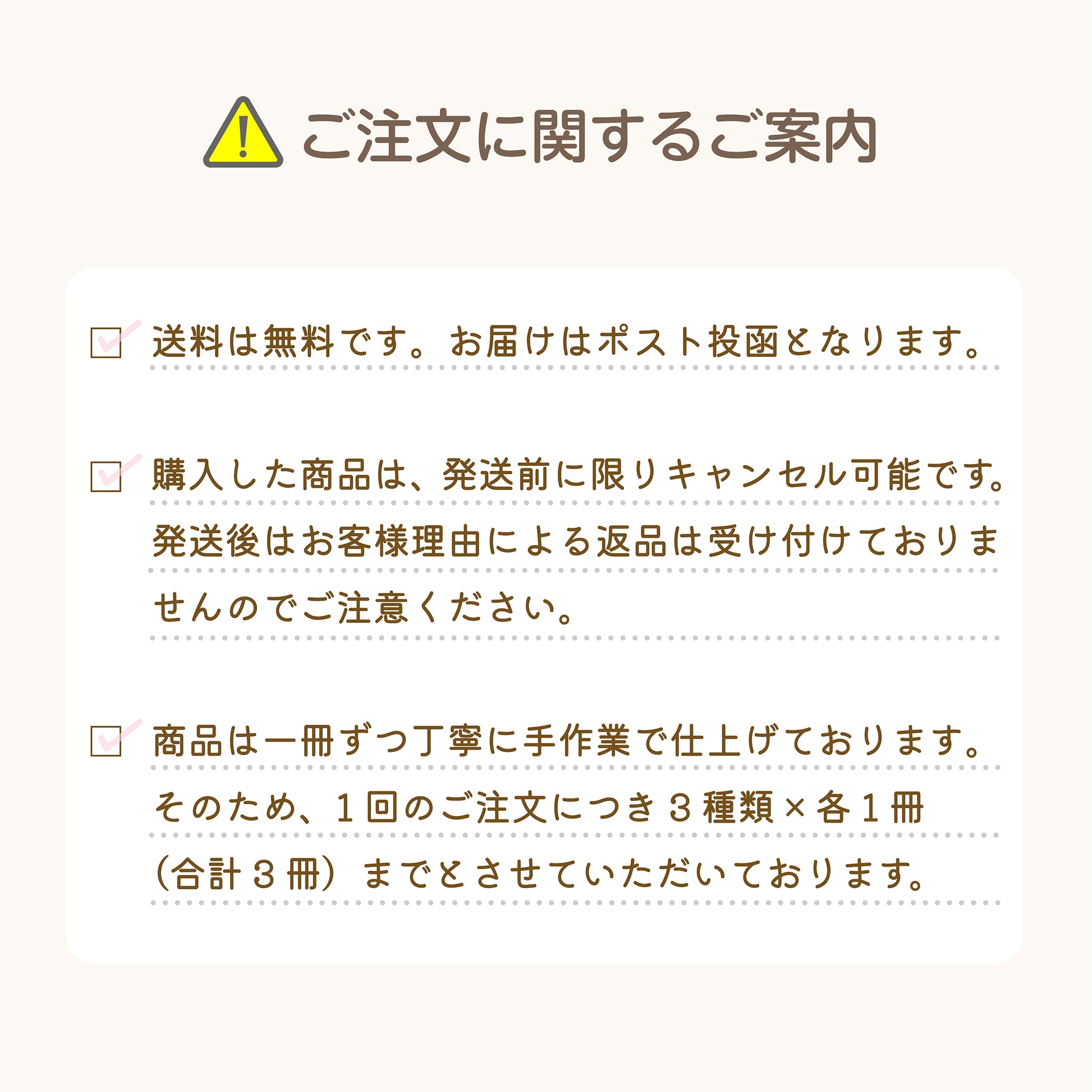・手作業で仕上げているため、実物の色合いや風合いは一点ごとに異なります。同じものは二つとない、一点物ならではの味わいをお楽しみください。・上記理由により在庫に限りがございます。1回のご注文につき、3種×各1冊(合計3冊)までとさせていただいております。あらかじめご了承ください。